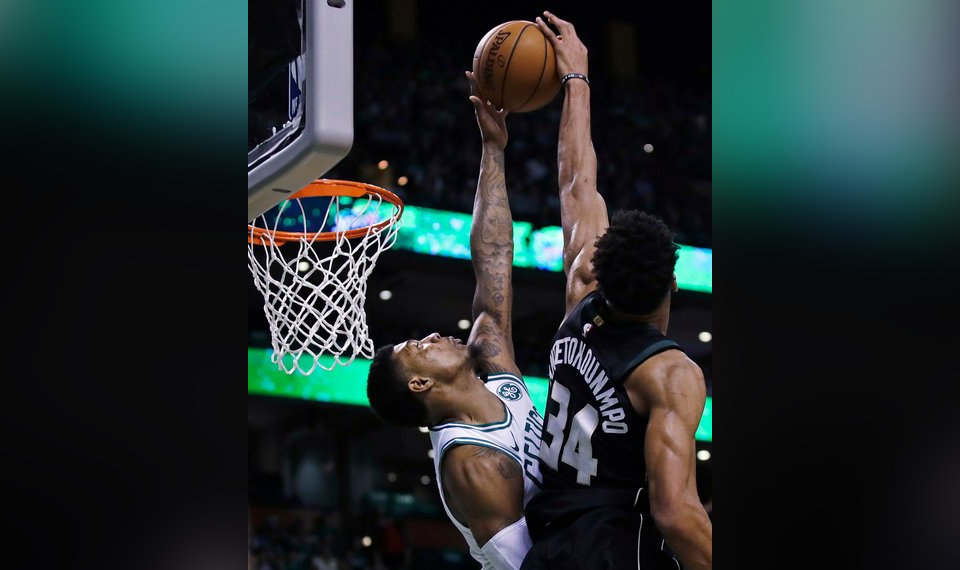 I love the above photo. Blocking the Greek Freak at the hoop. He backs down from nothing. And damn it, he is hitting his shots now. So many of our readers had correctly commented that his shot always seemed sound mechanically, but maybe he had a hard time transitioning from intense, in-your-shirt defender to a relaxed, focused shooter.