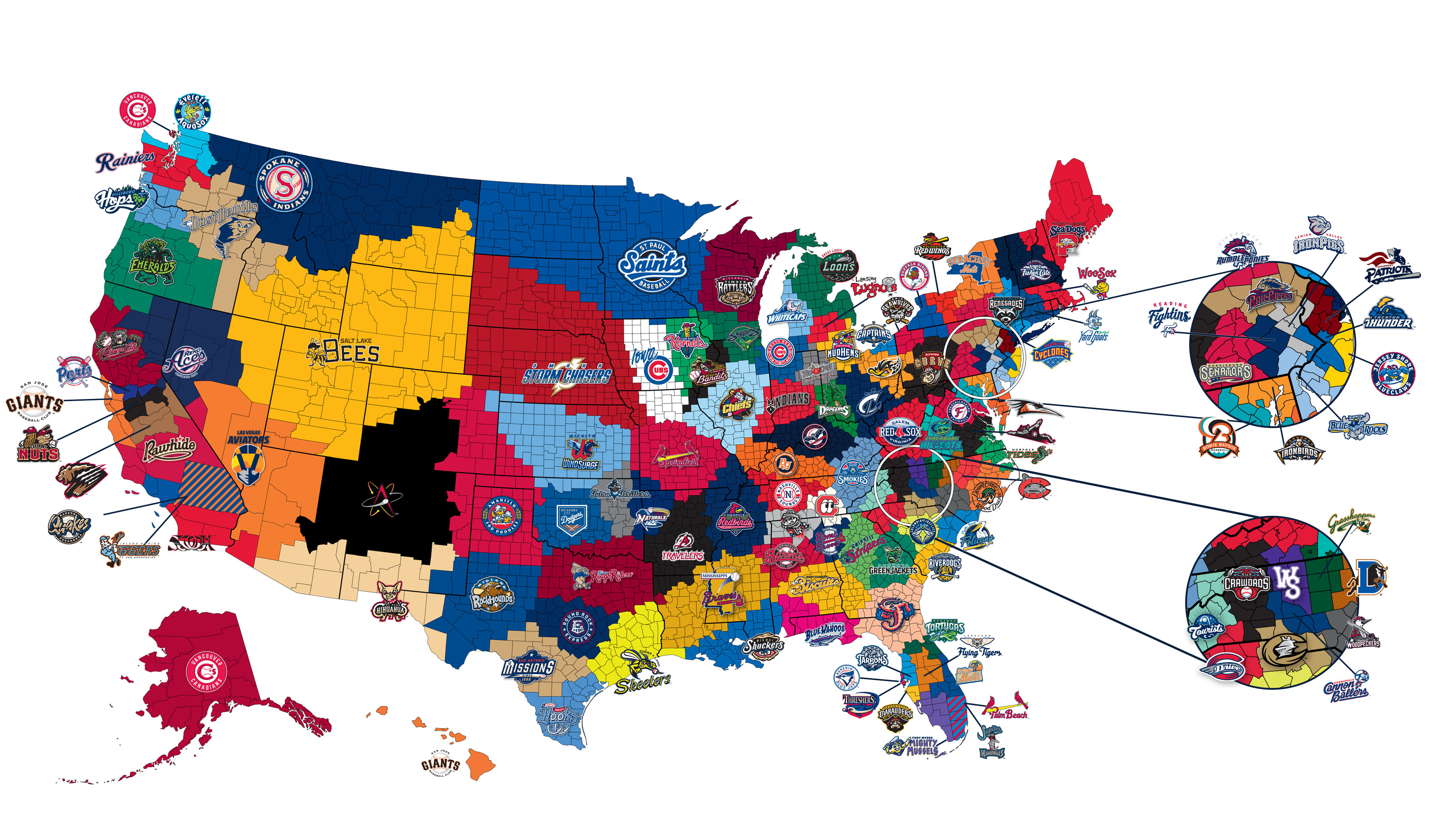 Just a quick reminder that MiLB.tv is free this weekend. Also, while this map looks like the dreaded MLB blackout map, it’s actually a fun way to see where all the affiliated minor league teams are. You can quibble about individual counties and what territory they are in, but it is still cool to see the location of all 120 teams. They even gave one island in Washington State to the Vancouver Canadians.