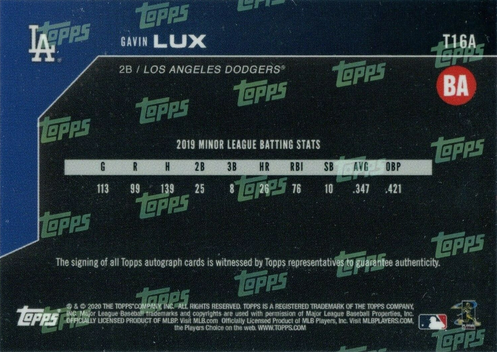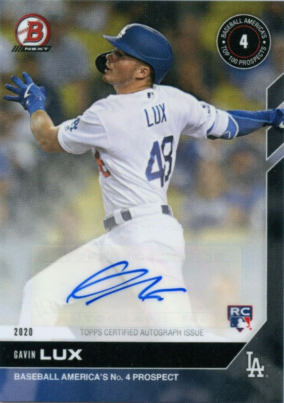 The second wave of Topps 2020 Bowman Next online exclusive brand have been arriving on collectors stoops, and this time only one Dodger prospect is available in the 15-card offering. It is second base phenom and the #2 prospect in the country, Gavin Lux. A total of 750 sets were ordered, which translates to an autograph print run of 75. Go here for a complete checklist.